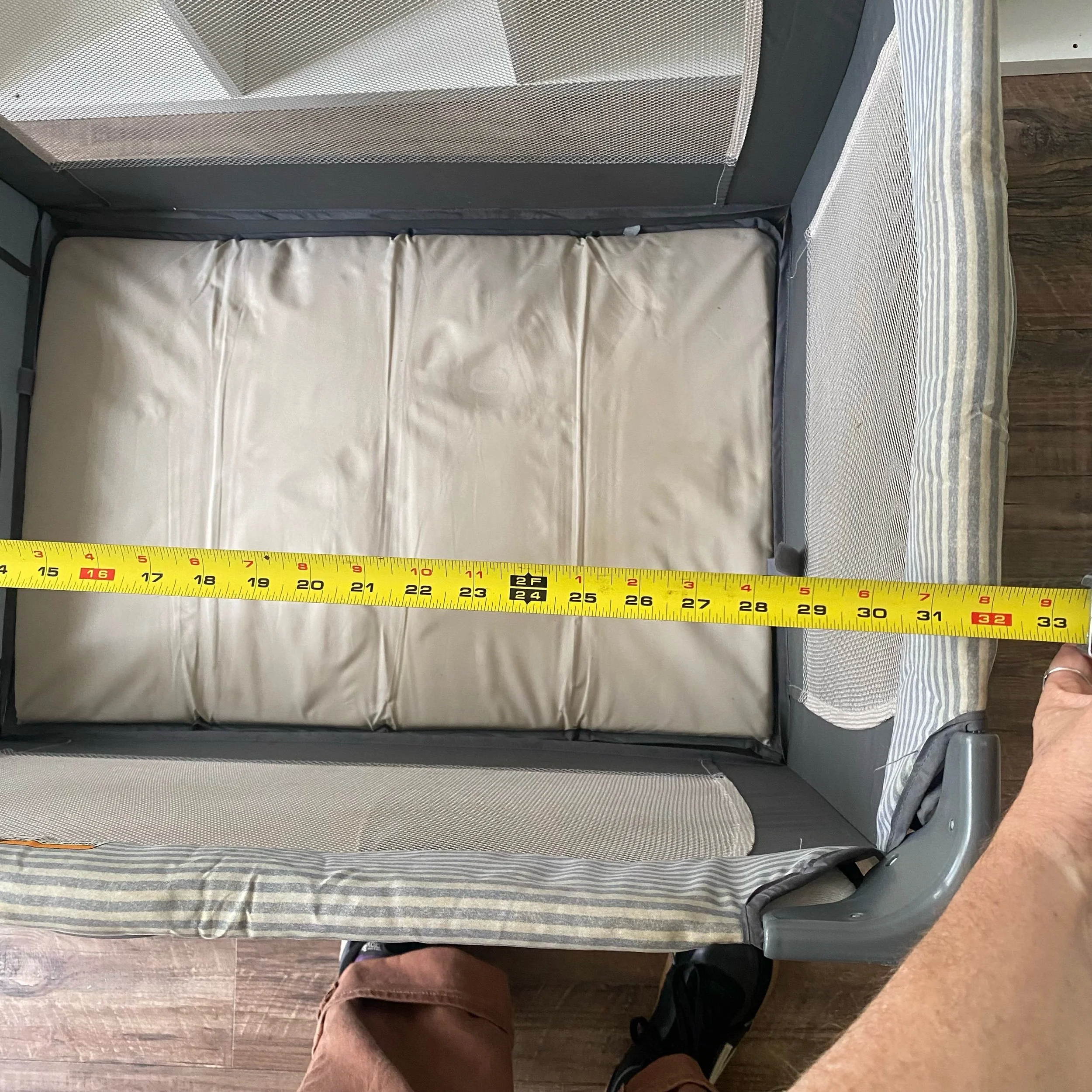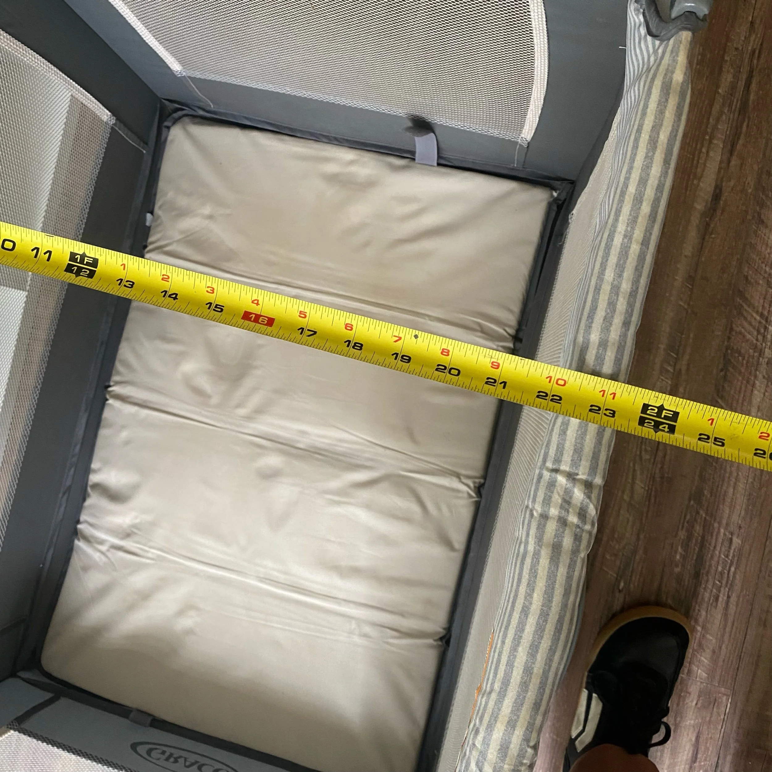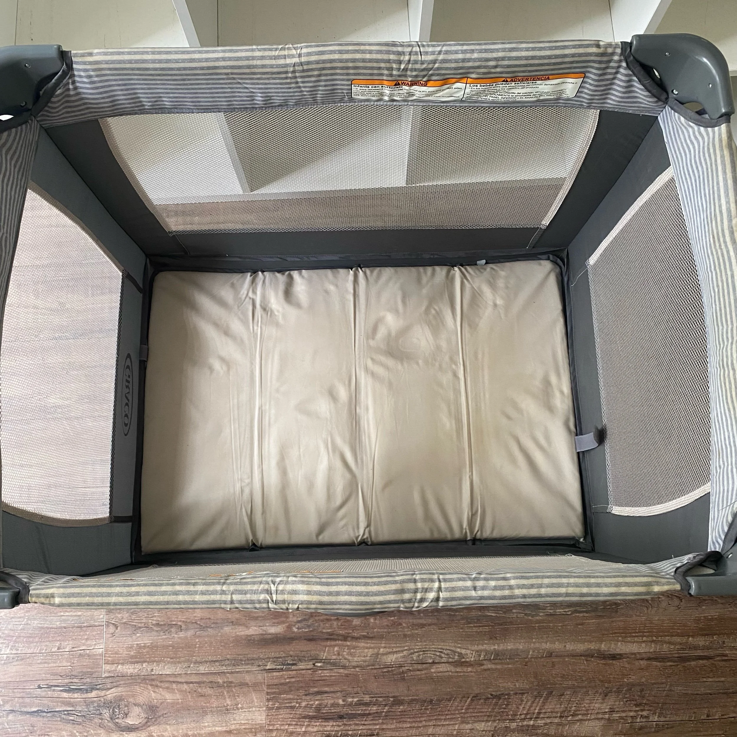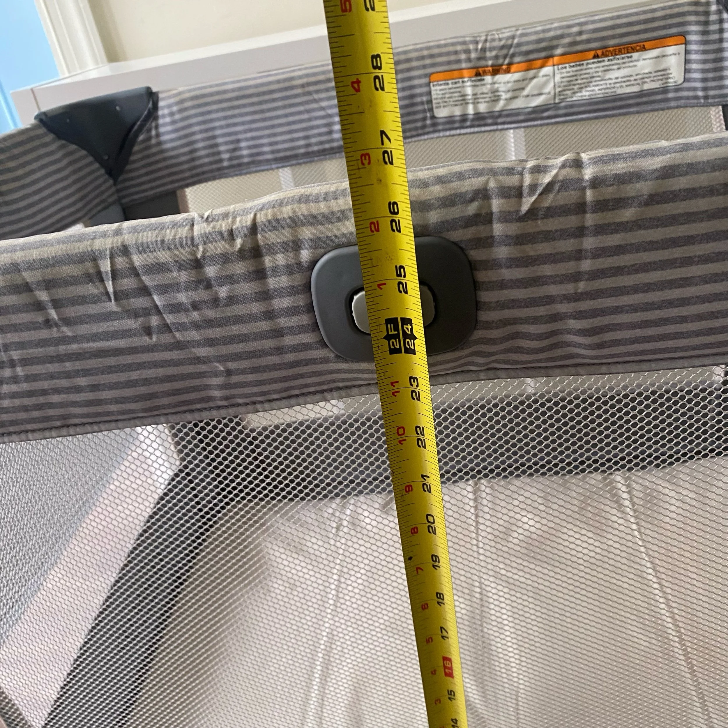 Smaller than the standard Pack N Play, this is a bassinet size. Some discoloration on all of the top rails. Comes with a great backpack-style carrying bag.