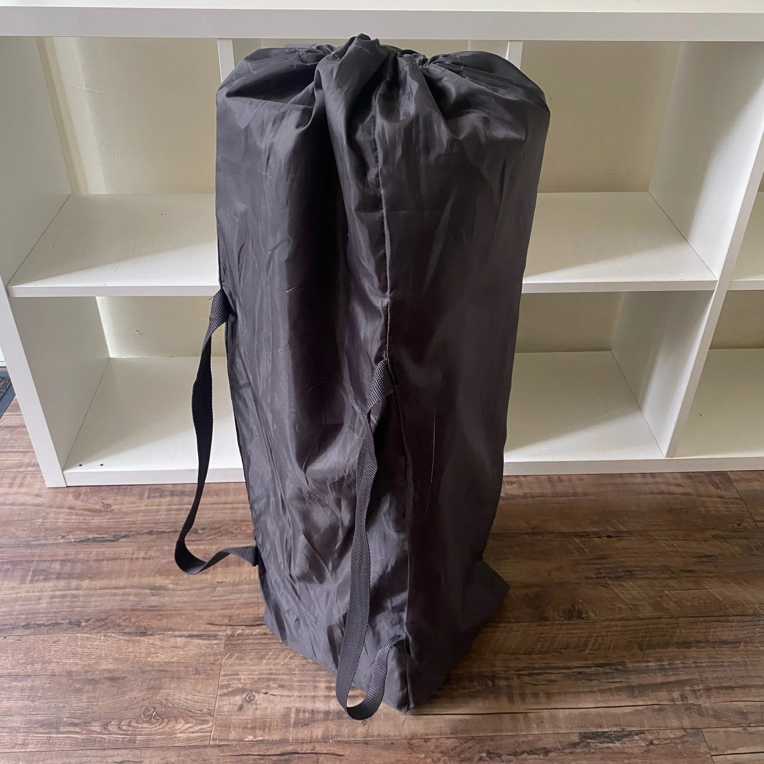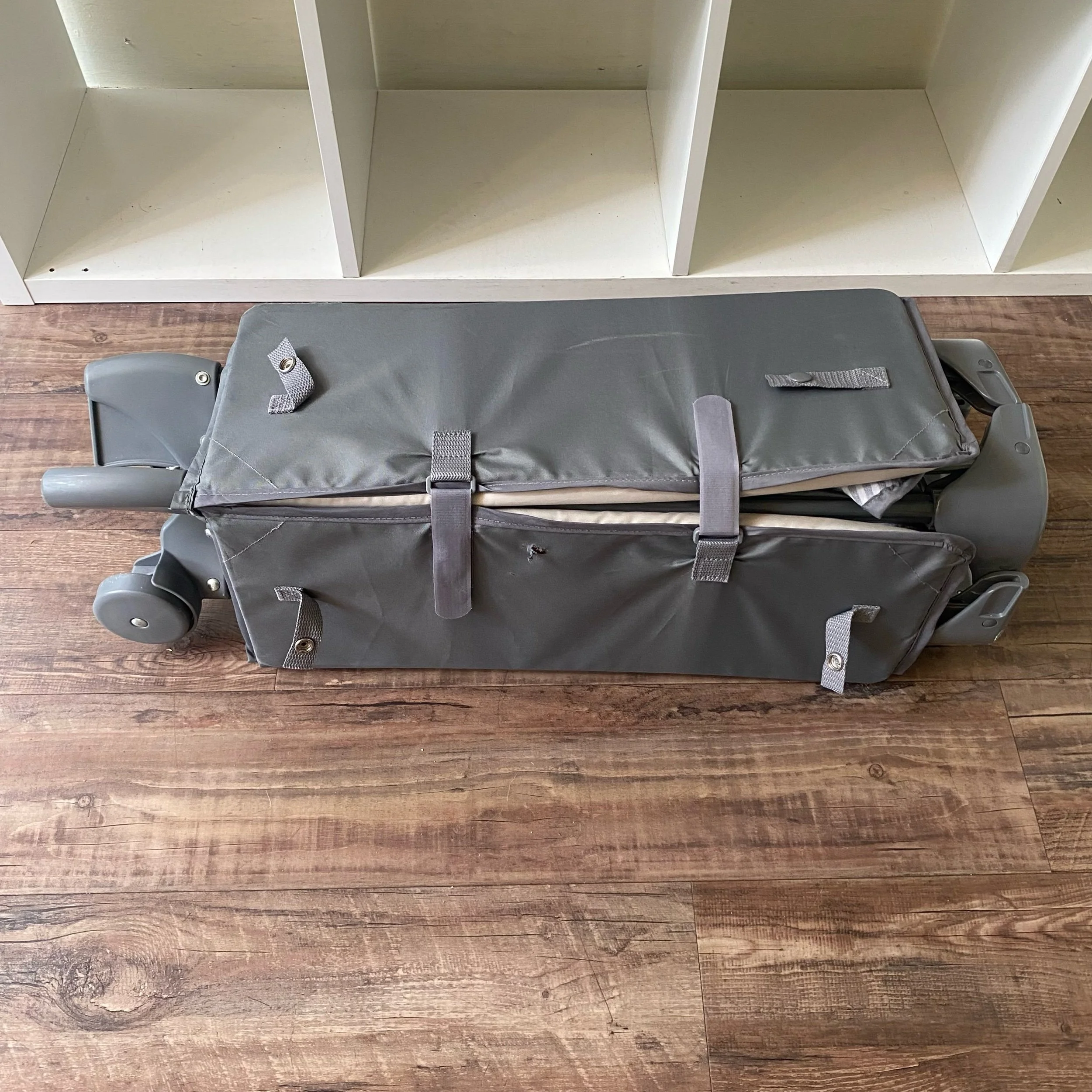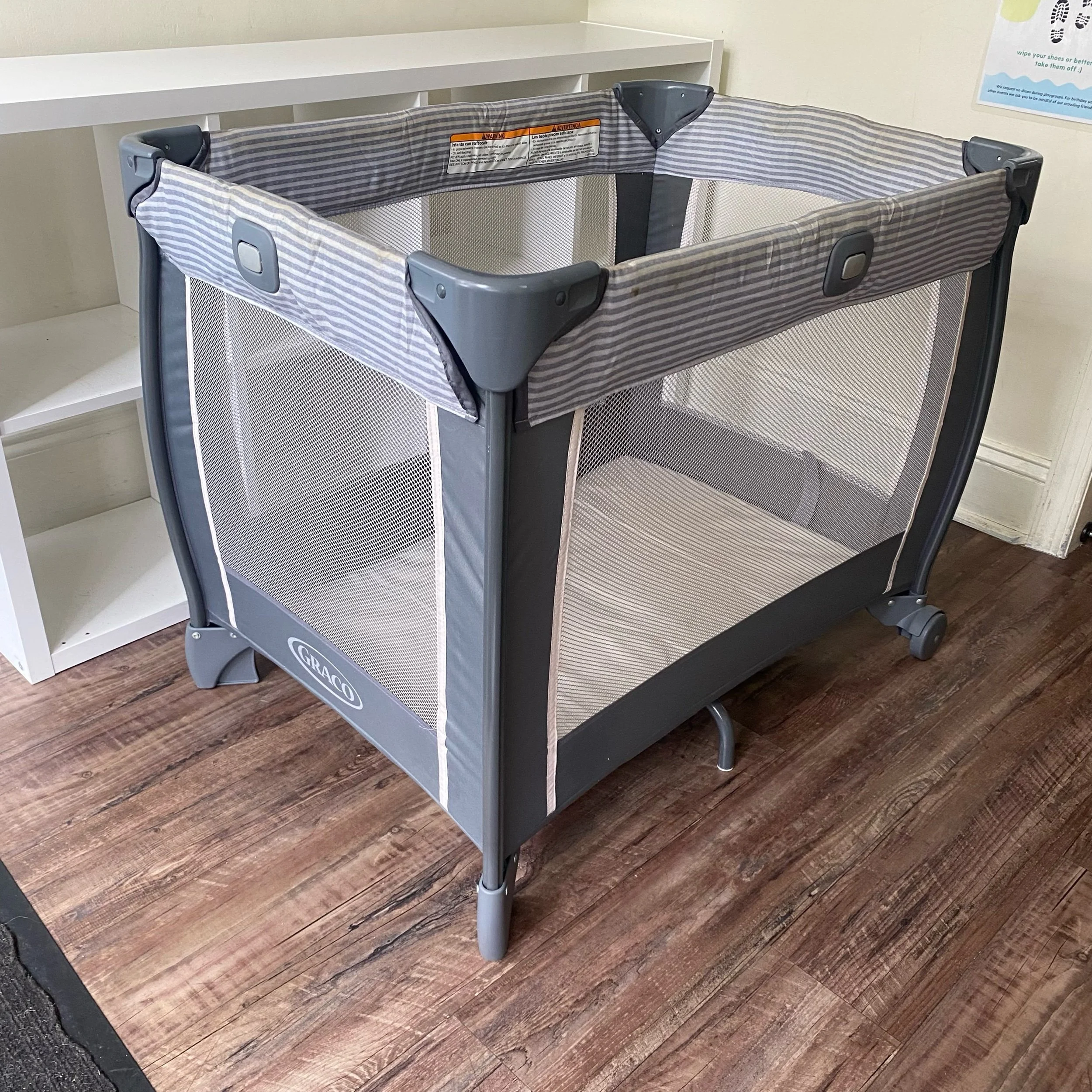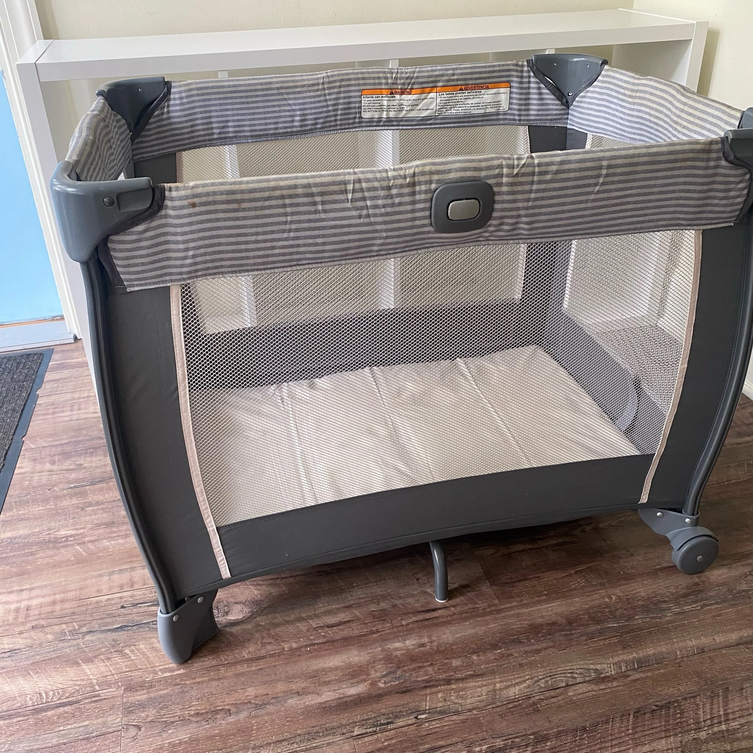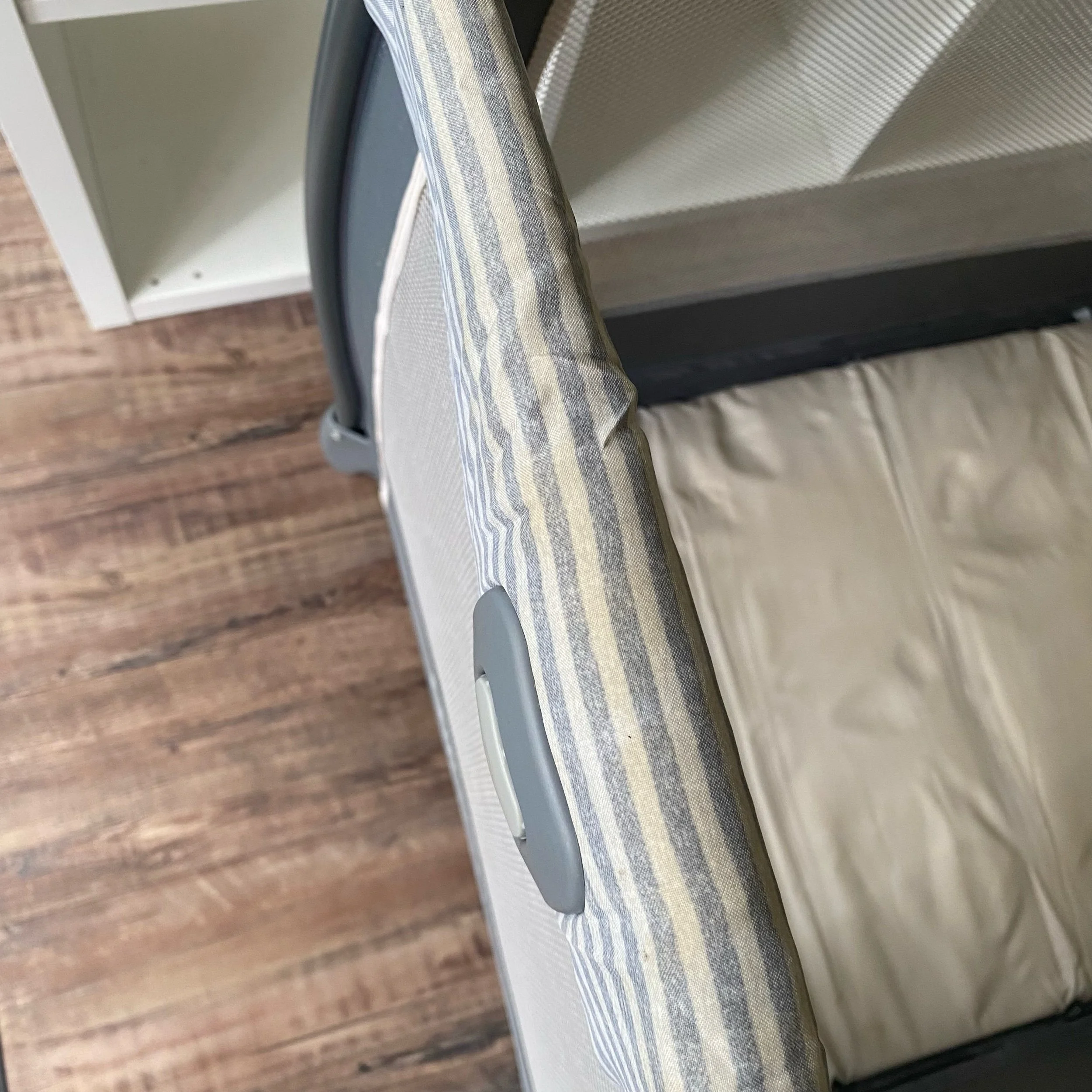 Smaller than the standard Pack N Play, this is a bassinet size. Some discoloration on all of the top rails. Comes with a great backpack-style carrying bag.