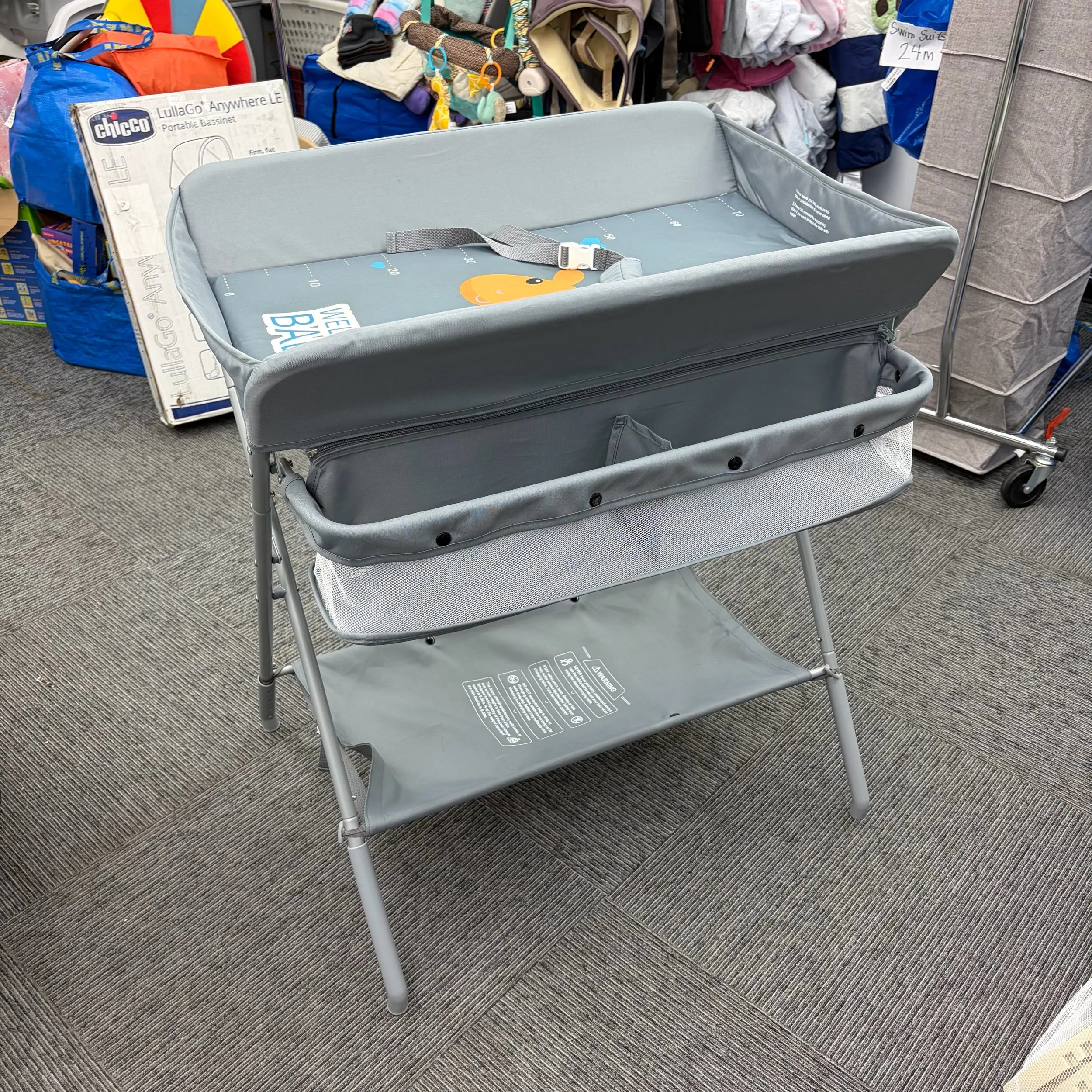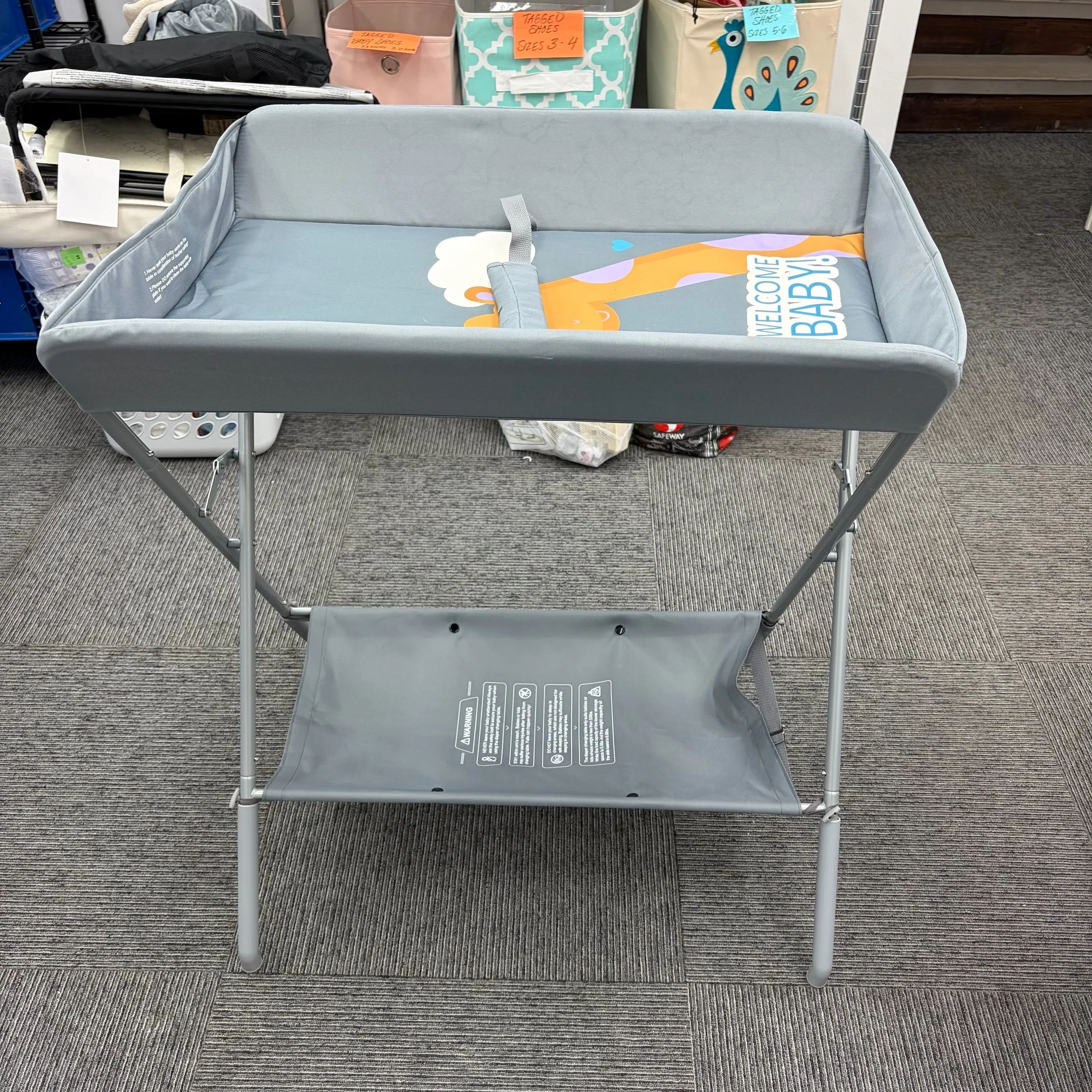 Height adjustable with storage racks and safety belt. Retails $79.99.